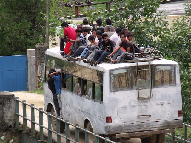 The aim is get as many passengers on board as possible, and there is always room for one more person. Most buses are made for Nepali size people meaning Ben can't stand upright or fit in the seats (no leg room). We've had babies and kids put on our laps, and its not uncommon to get a stray elbow or bottom in your face if you are sitting. When there is no more space inside, passengers sit on the roof. We've seen buses so overloaded that people are hanging off the back stairs and out the door. Buses are not only crammed with people, but also with their luggage. There's bags of all shapes and sizes down the aisle, and on the roof. During dasain we'd see buses with 20 goats on the roof!